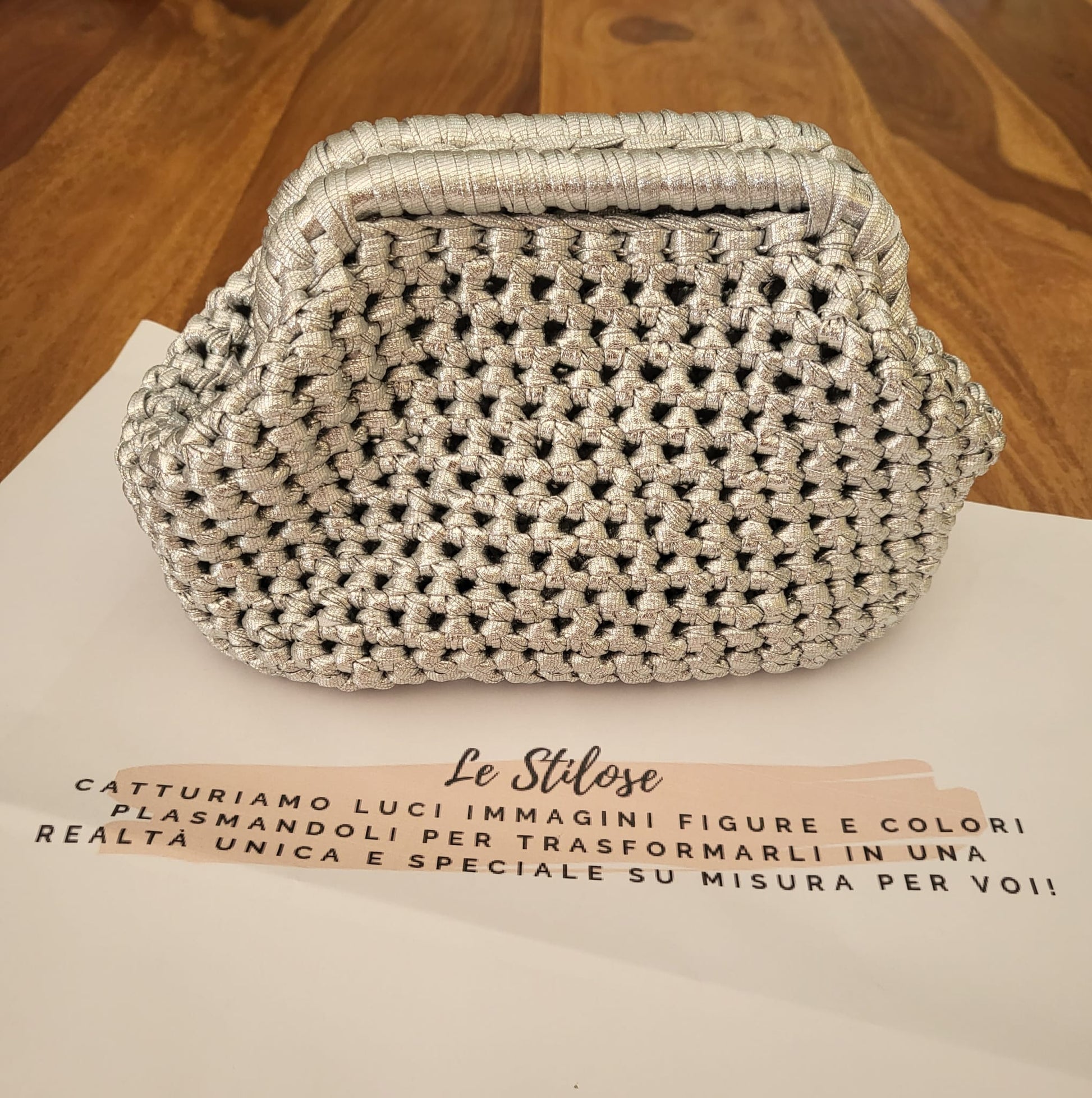 La nuovissima Clutch color argento, realizzata all'uncinetto con fettuccia lycra lux, per un look sofisticato e contemporaneo.